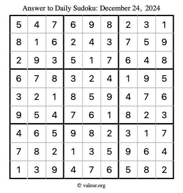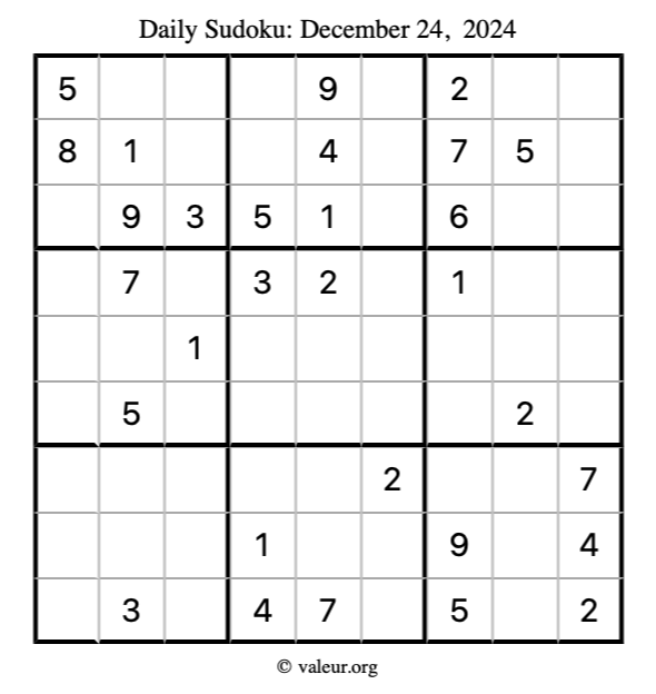 Here is the December 24, 2024 sudoku puzzle. You are welcome to print a copy to solve by hand. For your convenience, we have also included the solution further down the page so you can check your work.
