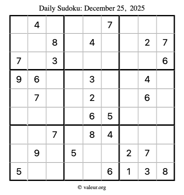 Here is the December 25, 2025 sudoku puzzle. You are welcome to print a copy to solve by hand. For your convenience, we have also included the solution further down the page so you can check your work.