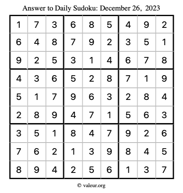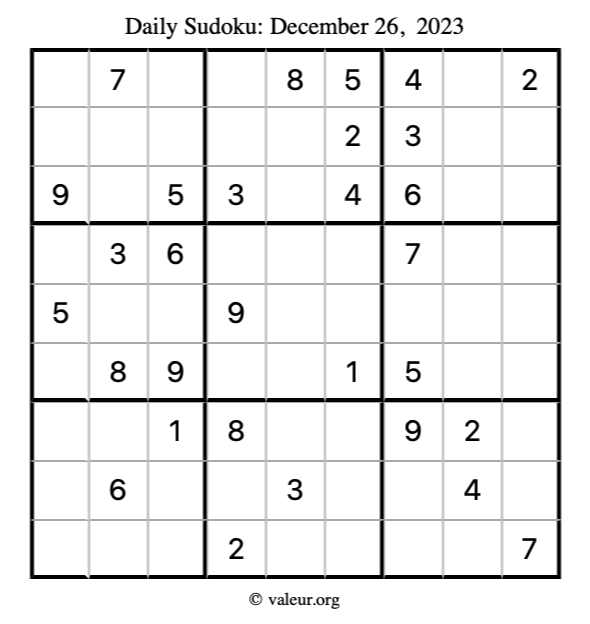 Here is the December 26, 2023 sudoku puzzle. You are welcome to print a copy to solve by hand. For your convenience, we have also included the solution further down the page so you can check your work.