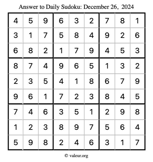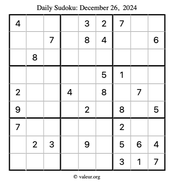 Here is the December 26, 2024 sudoku puzzle. You are welcome to print a copy to solve by hand. For your convenience, we have also included the solution further down the page so you can check your work.