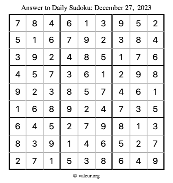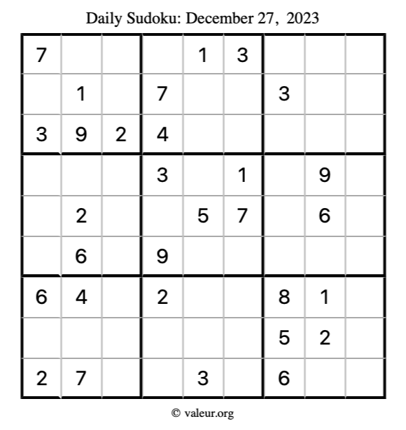 Here is the December 27, 2023 sudoku puzzle. You are welcome to print a copy to solve by hand. For your convenience, we have also included the solution further down the page so you can check your work.
