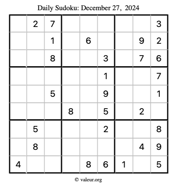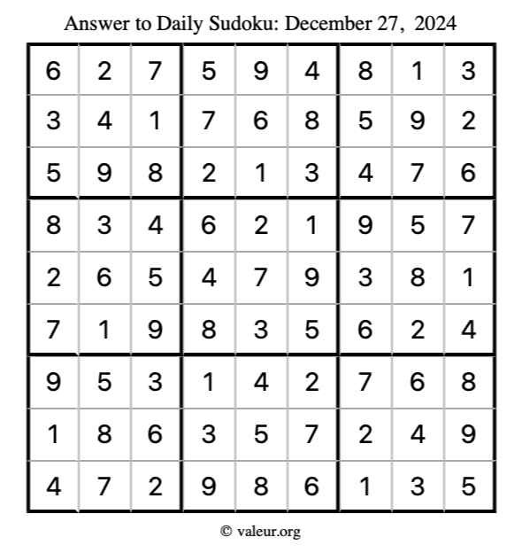 Here is the December 27, 2024 sudoku puzzle. You are welcome to print a copy to solve by hand. For your convenience, we have also included the solution further down the page so you can check your work.