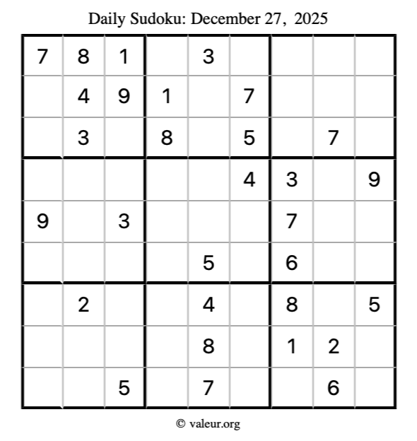 Here is the December 27, 2025 sudoku puzzle. You are welcome to print a copy to solve by hand. For your convenience, we have also included the solution further down the page so you can check your work.