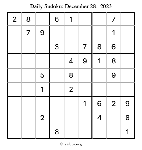 Here is the December 28, 2023 sudoku puzzle. You are welcome to print a copy to solve by hand. For your convenience, we have also included the solution further down the page so you can check your work.
