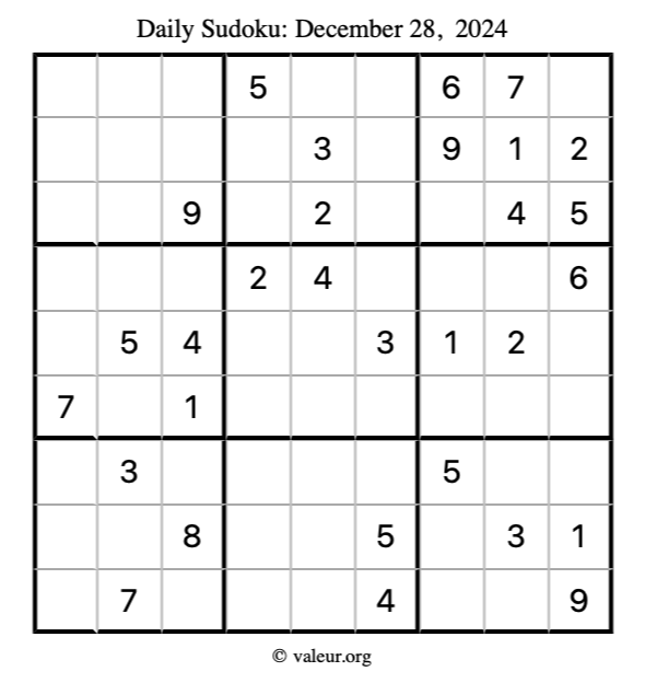 Here is the December 28, 2024 sudoku puzzle. You are welcome to print a copy to solve by hand. For your convenience, we have also included the solution further down the page so you can check your work.
