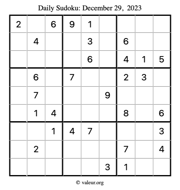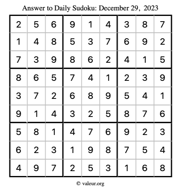 Here is the December 29, 2023 sudoku puzzle. You are welcome to print a copy to solve by hand. For your convenience, we have also included the solution further down the page so you can check your work.