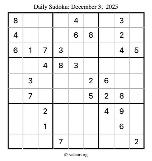 Here is the December 3, 2025 sudoku puzzle. You are welcome to print a copy to solve by hand. For your convenience, we have also included the solution further down the page so you can check your work.