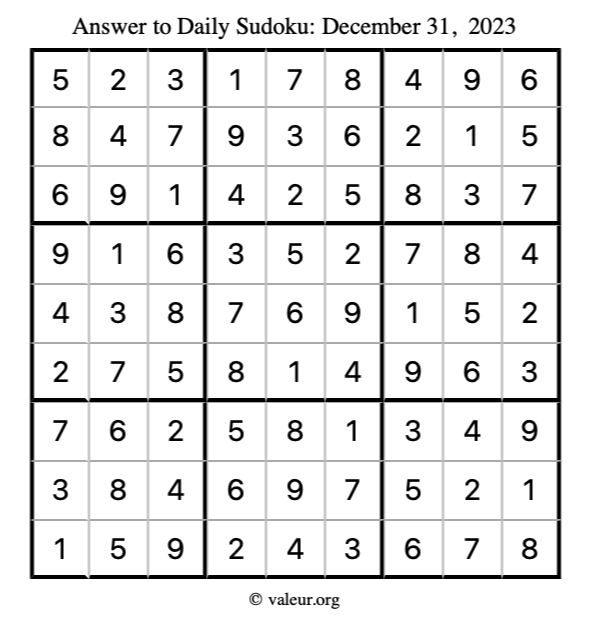 Here is the December 31, 2023 sudoku puzzle. You are welcome to print a copy to solve by hand. For your convenience, we have also included the solution further down the page so you can check your work.