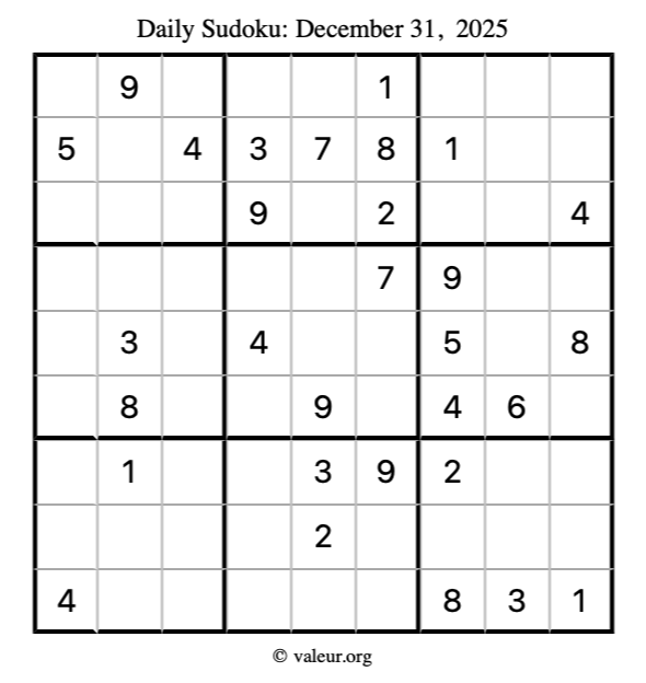 Here is the December 31, 2025 sudoku puzzle. You are welcome to print a copy to solve by hand. For your convenience, we have also included the solution further down the page so you can check your work.