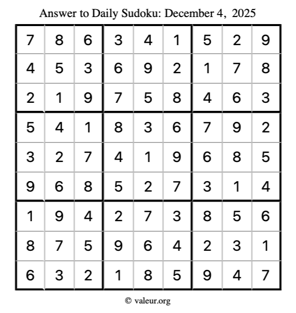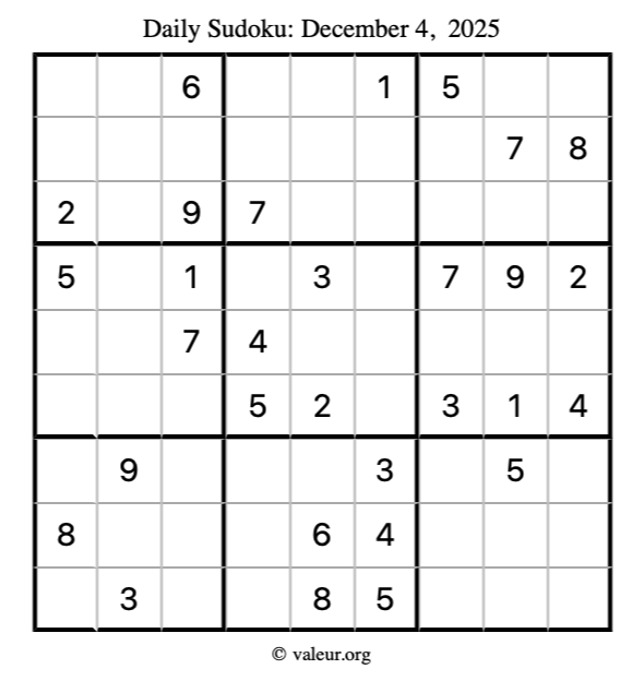 Here is the December 4, 2025 sudoku puzzle. You are welcome to print a copy to solve by hand. For your convenience, we have also included the solution further down the page so you can check your work.