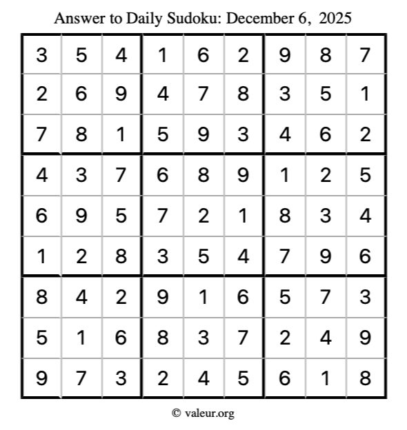 Here is the December 6, 2025 sudoku puzzle. You are welcome to print a copy to solve by hand. For your convenience, we have also included the solution further down the page so you can check your work.