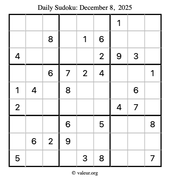Here is the December 8, 2025 sudoku puzzle. You are welcome to print a copy to solve by hand. For your convenience, we have also included the solution further down the page so you can check your work.