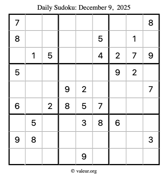 Here is the December 9, 2025 sudoku puzzle. You are welcome to print a copy to solve by hand. For your convenience, we have also included the solution further down the page so you can check your work.