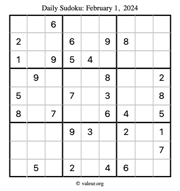 Here is the February 1, 2024 sudoku puzzle. You are welcome to print a copy to solve by hand. For your convenience, we have also included the solution further down the page so you can check your work.