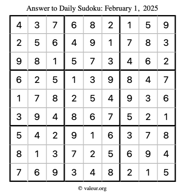 As promised, here is the solution to the February 1, 2025 sudoku puzzle: