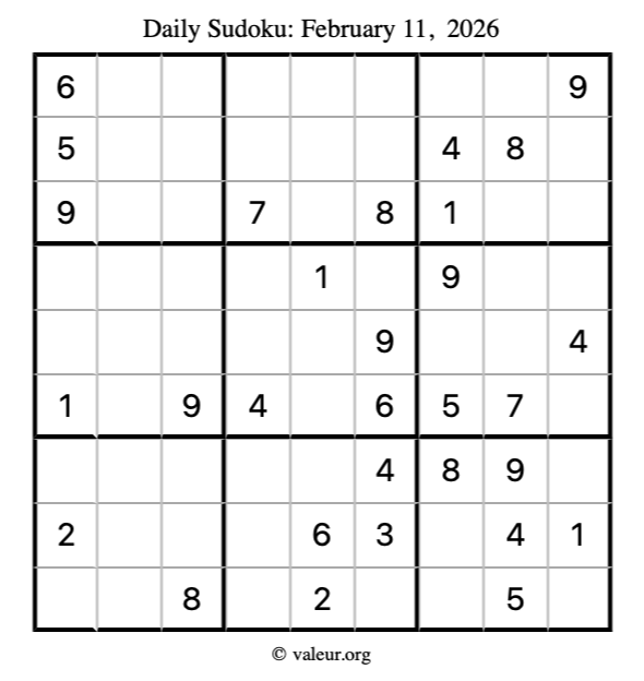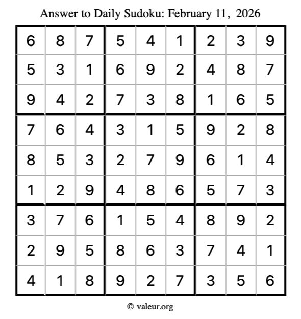 Here is the February 11, 2026 sudoku puzzle. You are welcome to print a copy to solve by hand. For your convenience, we have also included the solution further down the page so you can check your work.