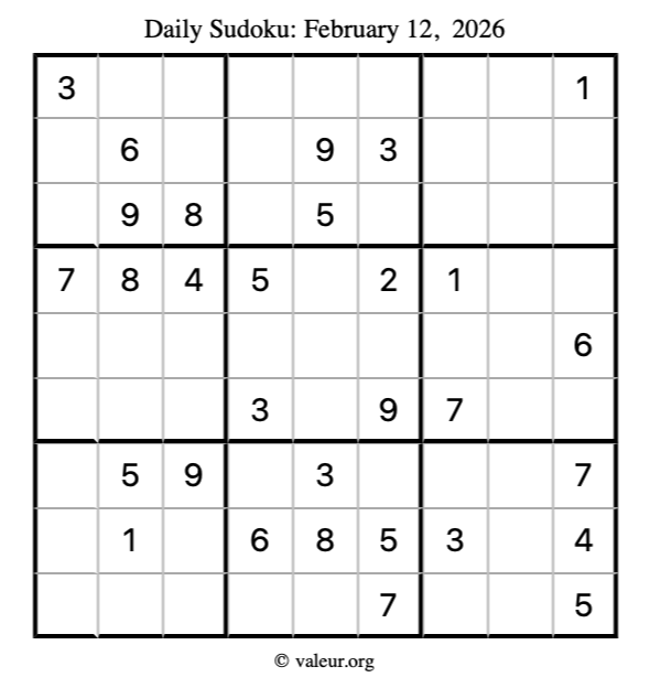 Here is the February 12, 2026 sudoku puzzle. You are welcome to print a copy to solve by hand. For your convenience, we have also included the solution further down the page so you can check your work.