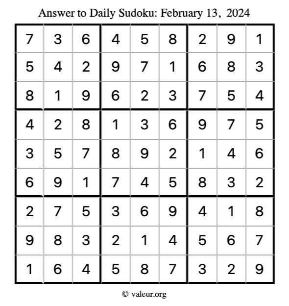 Here is the February 13, 2024 sudoku puzzle. You are welcome to print a copy to solve by hand. For your convenience, we have also included the solution further down the page so you can check your work.