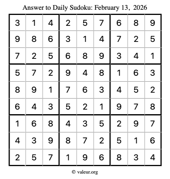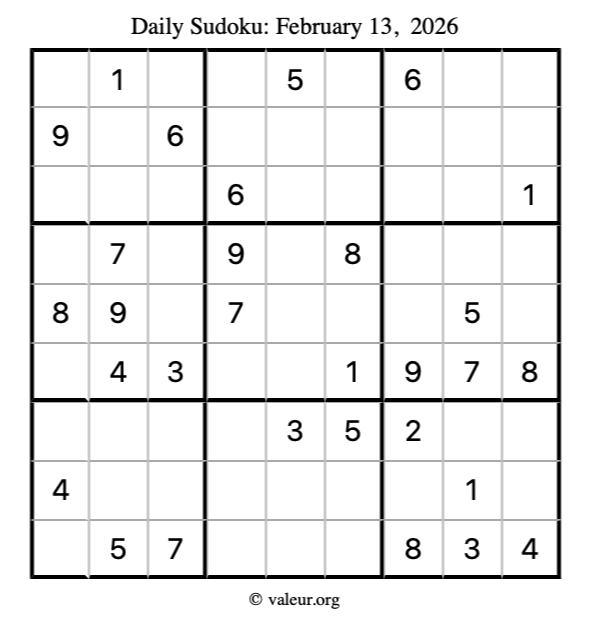 Here is the February 13, 2026 sudoku puzzle. You are welcome to print a copy to solve by hand. For your convenience, we have also included the solution further down the page so you can check your work.