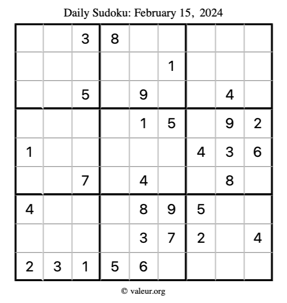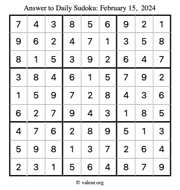 Here is the February 15, 2024 sudoku puzzle. You are welcome to print a copy to solve by hand. For your convenience, we have also included the solution further down the page so you can check your work.