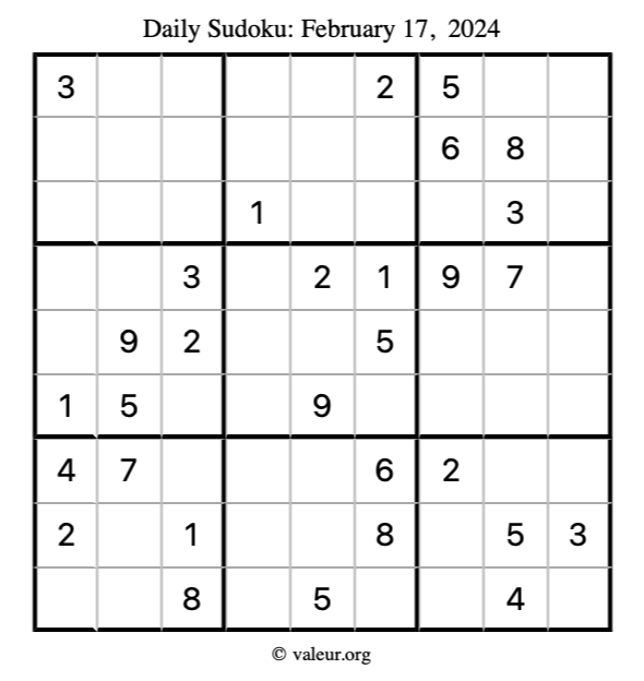 Here is the February 17, 2024 sudoku puzzle. You are welcome to print a copy to solve by hand. For your convenience, we have also included the solution further down the page so you can check your work.