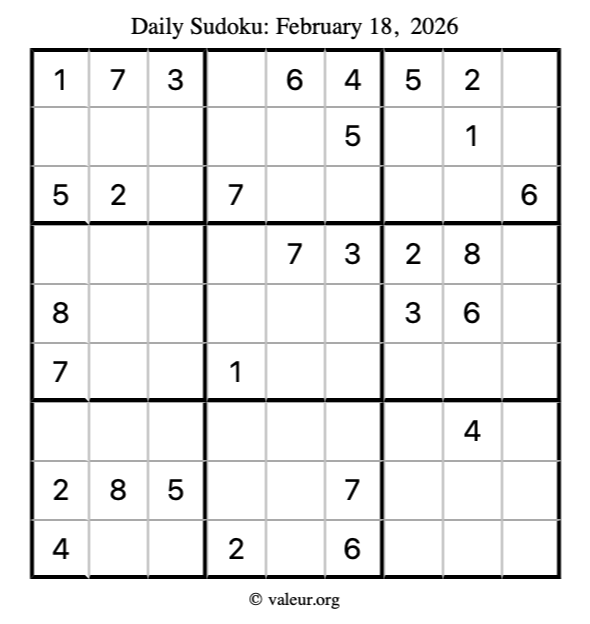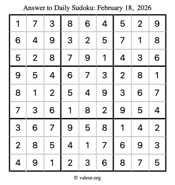 Here is the February 18, 2026 sudoku puzzle. You are welcome to print a copy to solve by hand. For your convenience, we have also included the solution further down the page so you can check your work.