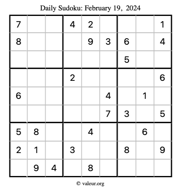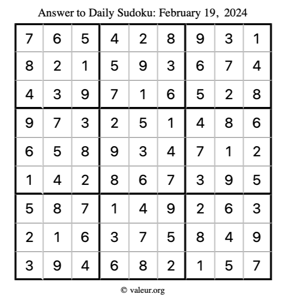 Here is the February 19, 2024 sudoku puzzle. You are welcome to print a copy to solve by hand. For your convenience, we have also included the solution further down the page so you can check your work.
