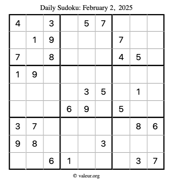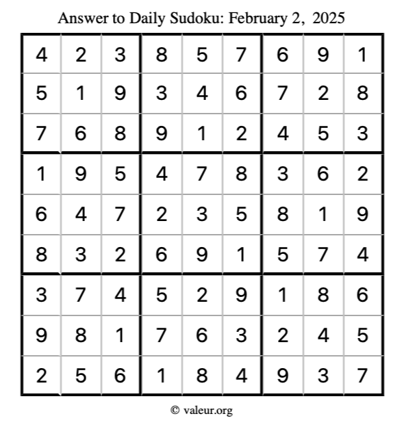 Here is the February 2, 2025 sudoku puzzle. You are welcome to print a copy to solve by hand. For your convenience, we have also included the solution further down the page so you can check your work.