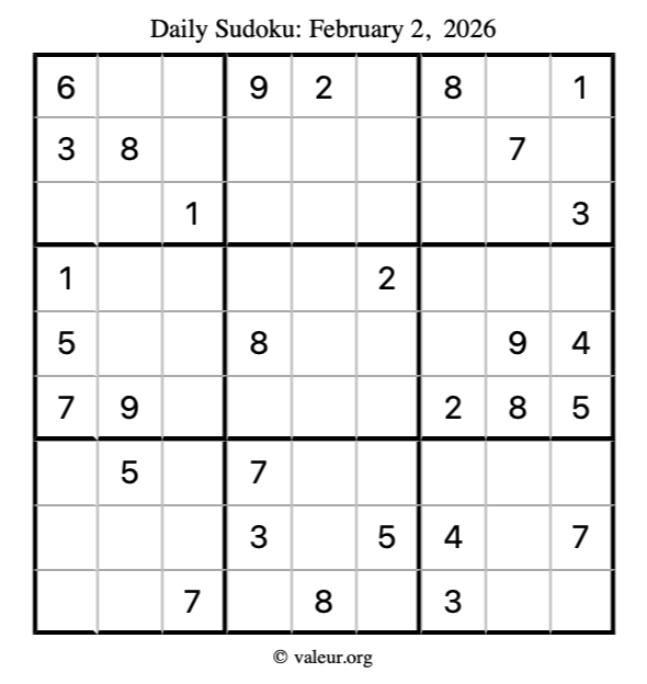 Here is the February 2, 2026 sudoku puzzle. You are welcome to print a copy to solve by hand. For your convenience, we have also included the solution further down the page so you can check your work.