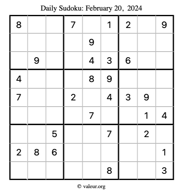 Here is the February 20, 2024 sudoku puzzle. You are welcome to print a copy to solve by hand. For your convenience, we have also included the solution further down the page so you can check your work.