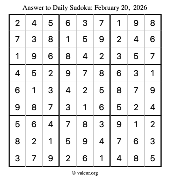 Here is the February 20, 2026 sudoku puzzle. You are welcome to print a copy to solve by hand. For your convenience, we have also included the solution further down the page so you can check your work.