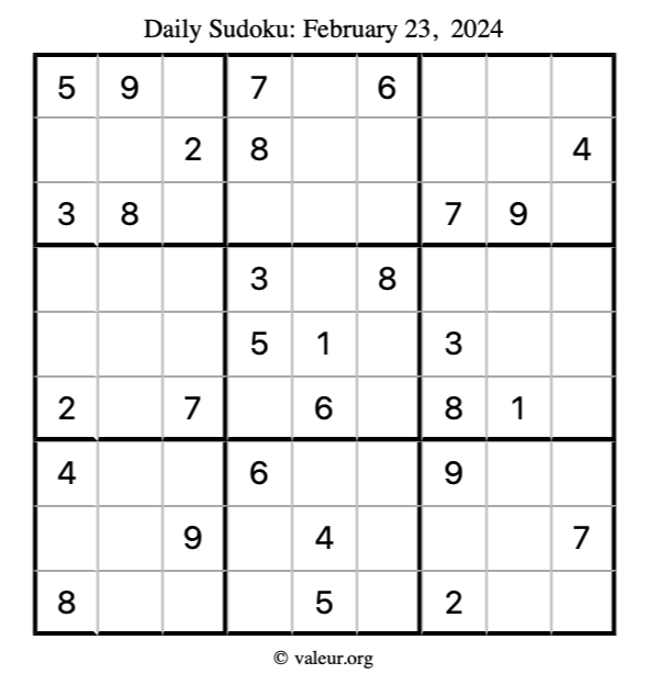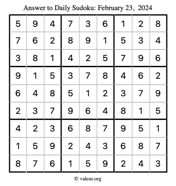 Here is the February 23, 2024 sudoku puzzle. You are welcome to print a copy to solve by hand. For your convenience, we have also included the solution further down the page so you can check your work.
