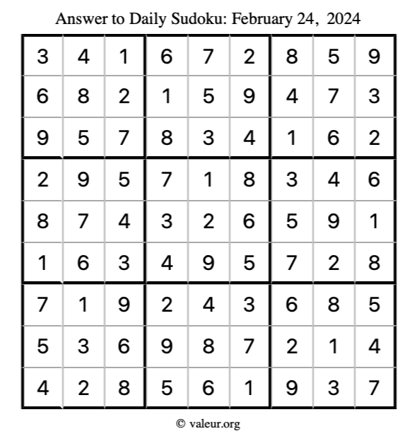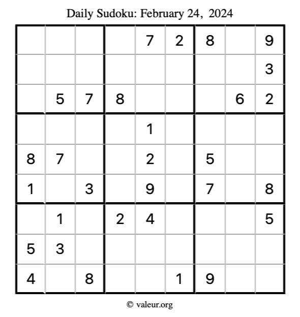 Here is the February 24, 2024 sudoku puzzle. You are welcome to print a copy to solve by hand. For your convenience, we have also included the solution further down the page so you can check your work.