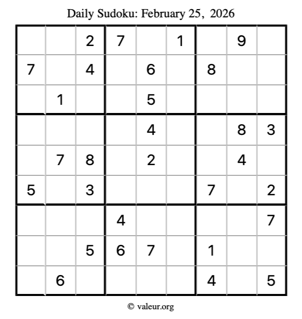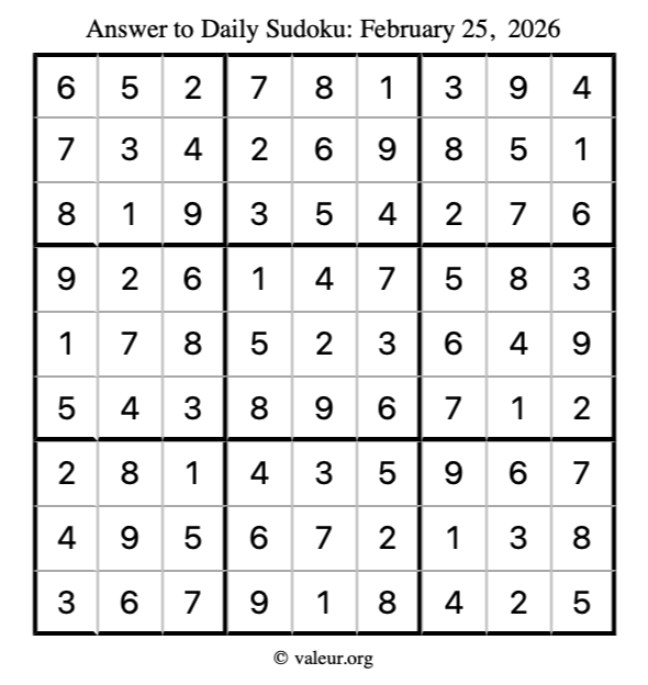 Here is the February 25, 2026 sudoku puzzle. You are welcome to print a copy to solve by hand. For your convenience, we have also included the solution further down the page so you can check your work.