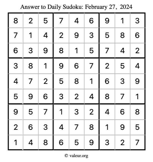 Here is the February 27, 2024 sudoku puzzle. You are welcome to print a copy to solve by hand. For your convenience, we have also included the solution further down the page so you can check your work.