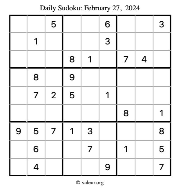 Sudoku February 27, 2024 is not the only sudoku puzzle we have. We create a new sudoku puzzle every day for you to print and solve. Check out today's puzzle here!