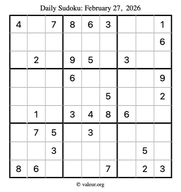 Here is the February 27, 2026 sudoku puzzle. You are welcome to print a copy to solve by hand. For your convenience, we have also included the solution further down the page so you can check your work.