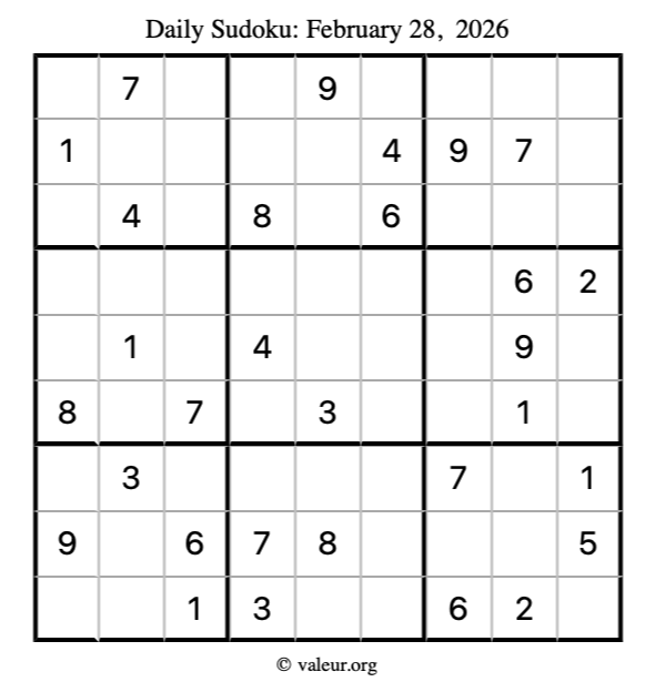 Here is the February 28, 2026 sudoku puzzle. You are welcome to print a copy to solve by hand. For your convenience, we have also included the solution further down the page so you can check your work.