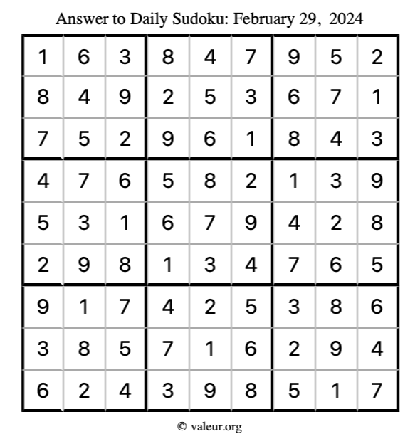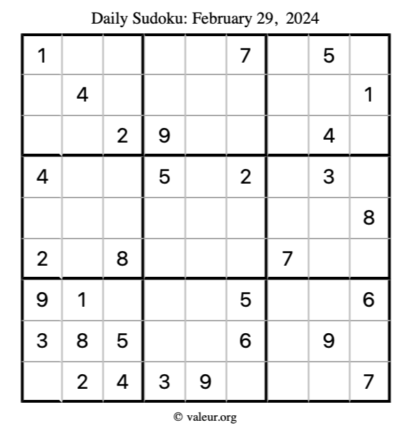 Here is the February 29, 2024 sudoku puzzle. You are welcome to print a copy to solve by hand. For your convenience, we have also included the solution further down the page so you can check your work.