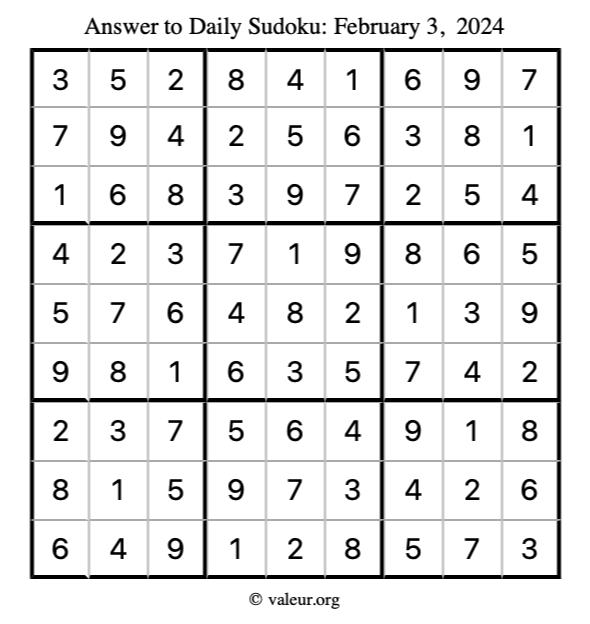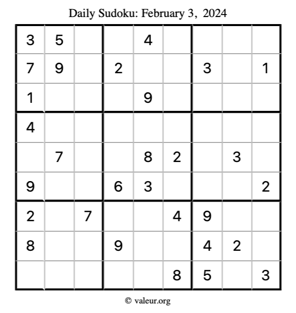 Here is the February 3, 2024 sudoku puzzle. You are welcome to print a copy to solve by hand. For your convenience, we have also included the solution further down the page so you can check your work.