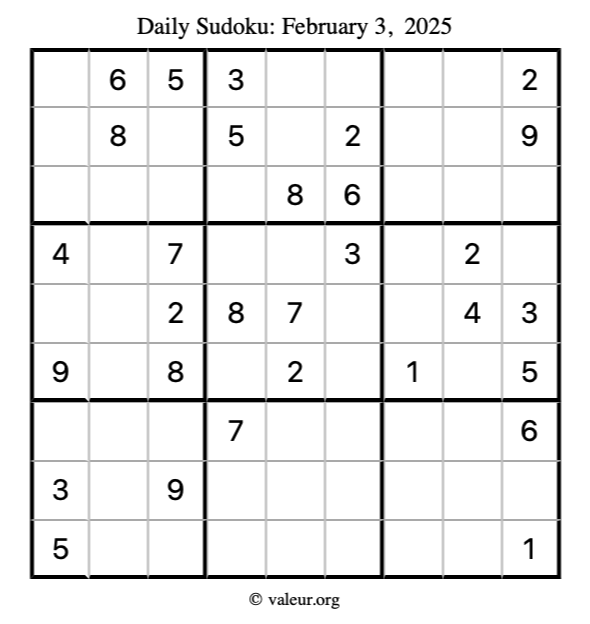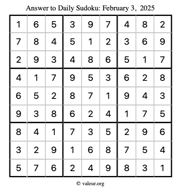 Here is the February 3, 2025 sudoku puzzle. You are welcome to print a copy to solve by hand. For your convenience, we have also included the solution further down the page so you can check your work.