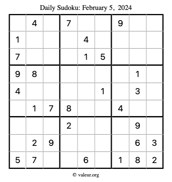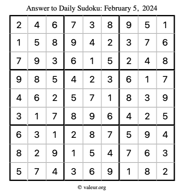 Here is the February 5, 2024 sudoku puzzle. You are welcome to print a copy to solve by hand. For your convenience, we have also included the solution further down the page so you can check your work.