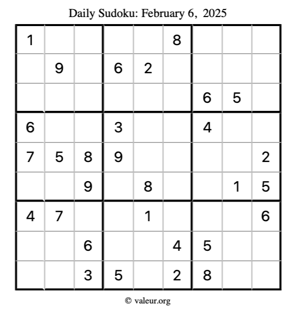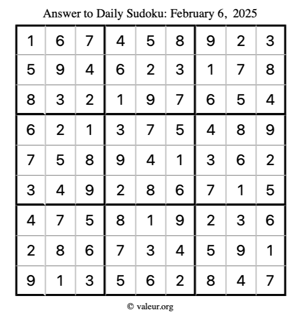 Here is the February 6, 2025 sudoku puzzle. You are welcome to print a copy to solve by hand. For your convenience, we have also included the solution further down the page so you can check your work.