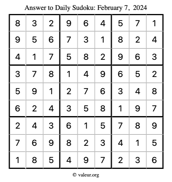 Here is the February 7, 2024 sudoku puzzle. You are welcome to print a copy to solve by hand. For your convenience, we have also included the solution further down the page so you can check your work.