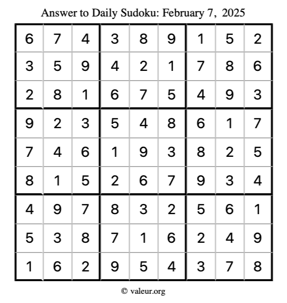 Here is the February 7, 2025 sudoku puzzle. You are welcome to print a copy to solve by hand. For your convenience, we have also included the solution further down the page so you can check your work.