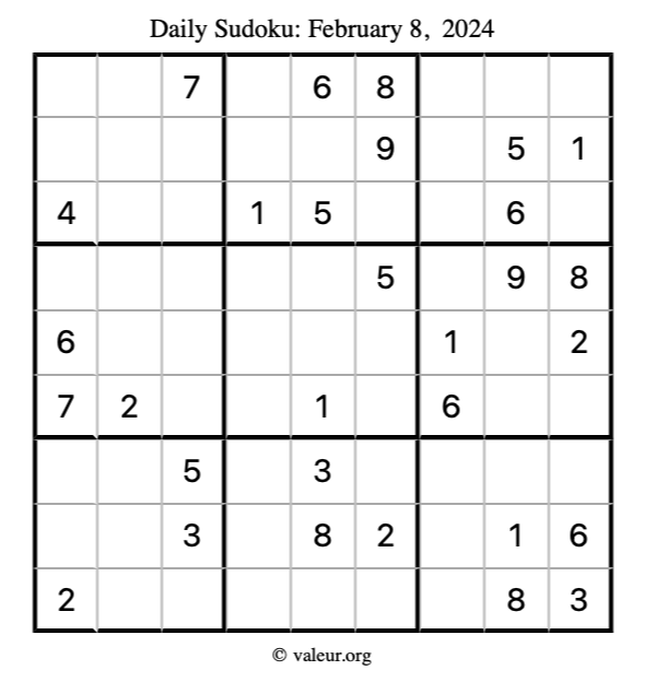 Here is the February 8, 2024 sudoku puzzle. You are welcome to print a copy to solve by hand. For your convenience, we have also included the solution further down the page so you can check your work.
