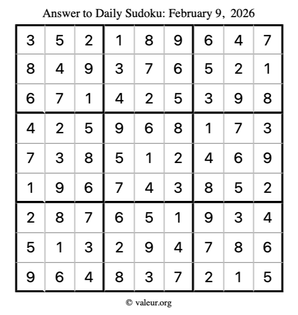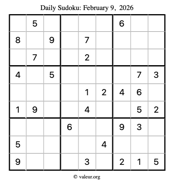 Here is the February 9, 2026 sudoku puzzle. You are welcome to print a copy to solve by hand. For your convenience, we have also included the solution further down the page so you can check your work.