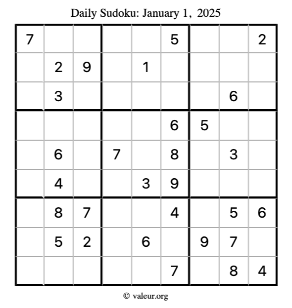 Here is the January 1, 2025 sudoku puzzle. You are welcome to print a copy to solve by hand. For your convenience, we have also included the solution further down the page so you can check your work.