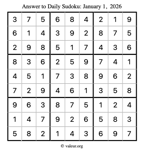 Here is the January 1, 2026 sudoku puzzle. You are welcome to print a copy to solve by hand. For your convenience, we have also included the solution further down the page so you can check your work.