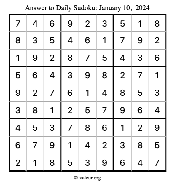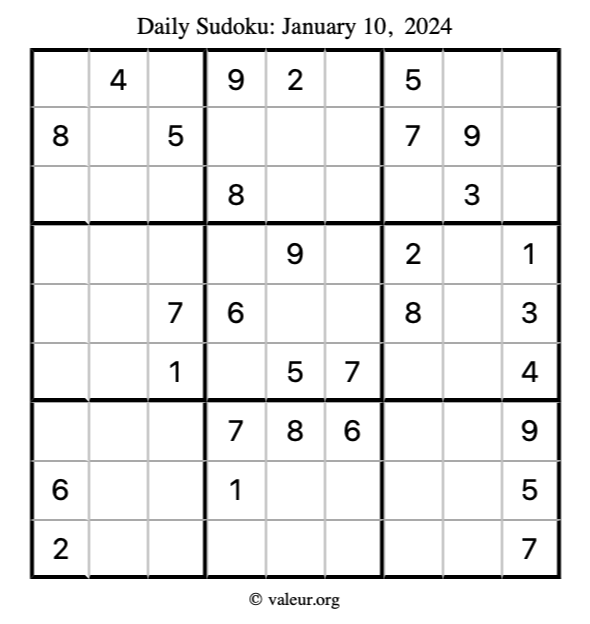 Here is the January 10, 2024 sudoku puzzle. You are welcome to print a copy to solve by hand. For your convenience, we have also included the solution further down the page so you can check your work.